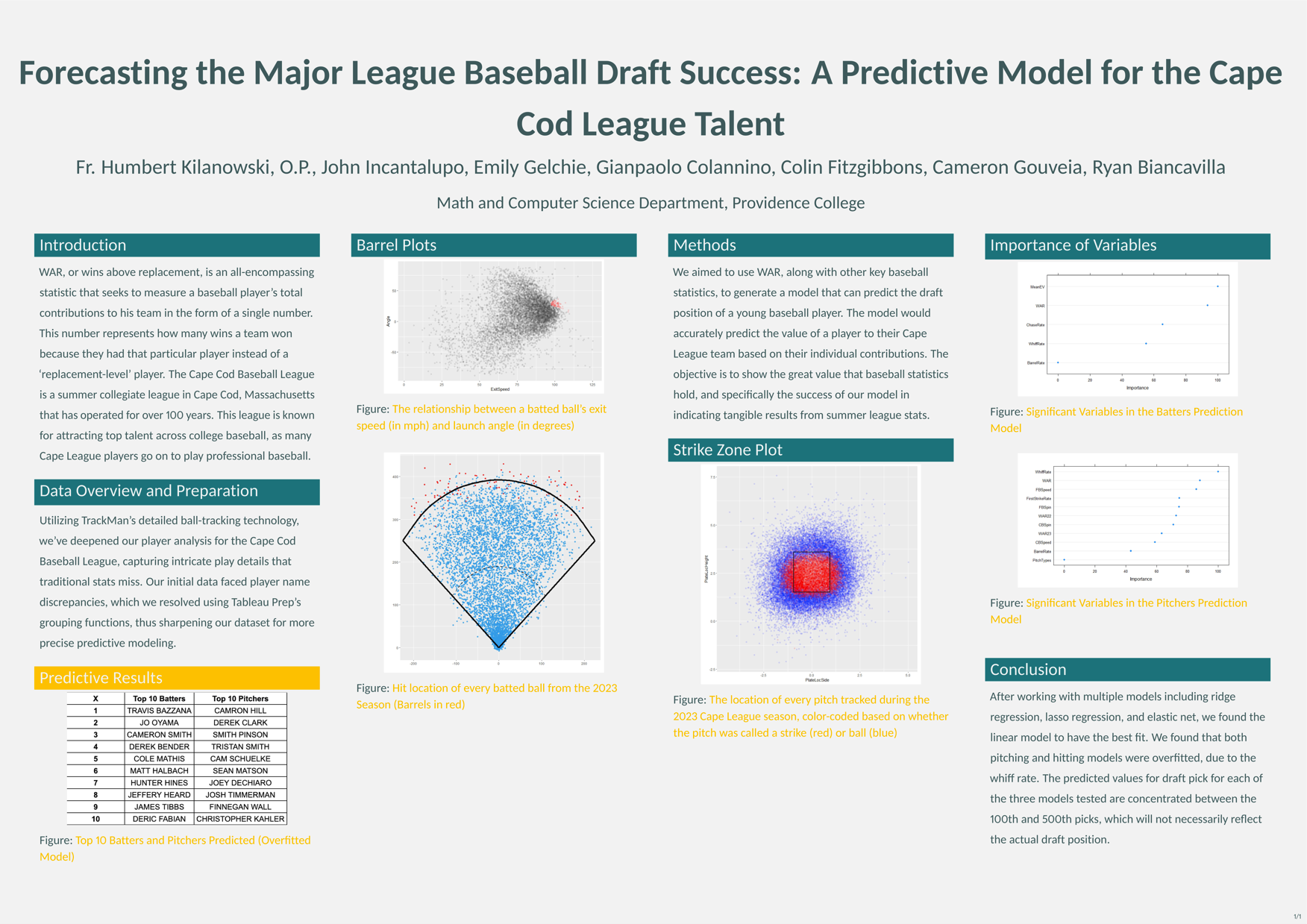 A year after my sabermetrics research course, I joined an independent study to continue the research that we had started. This time, we paired the WAR model that we had already created with that summer’s MLB draft results to determine if a player’s Cape League WAR was a strong predictor of future draft position. We also incorporated advanced pitching and batted ball data from TrackMan into our predictive model, which we tested on the upcoming 2024 MLB Draft. Since this project was completed prior to the 2024 MLB Draft, our predictions were only speculative at the time. My group presented the poster above at Providence College’s 15th Annual Celebration of Student Scholarship and Creativity in April 2024.
